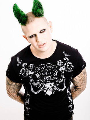 There's something very wrong with the image on the above left, and you may not see it if you aren't a photographer. This shot was taken at the end of a long long day, shooting 6 male models with very demanding hair and makeup requirements. The thing that's most wrong is the back ground, that fade to darker tones from the top down. I don't usually let that happen, and usually adjust the BG lights as needed. After 10 hours shooting I missed that, and this was THE photo. Happily, I did focus on the facial shadows and highlights because this pic was meant to be a very direct rip off of the original Keith Flint photograph. So I got the angle and top light right, and after much coaching the model finally got the facial vibe we were after.